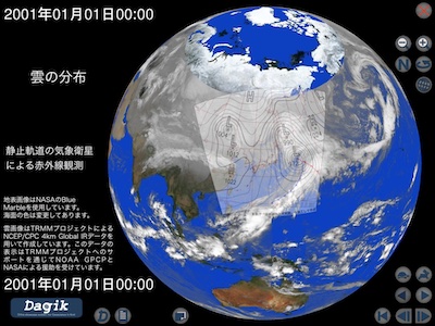 天気図画像: 気象庁「日本域地上天気図」を加工して作成しました。 データ: NCEP/CPC による 4km Global IR データ。このデータの表示はTRMMプロジェクトへのサポートを通じてNOAA GPCPとNASAによる援助を受けています。 データ提供: NOAA / National Centers for Environmental Prediction (NCEP) / Climate Prediction Center (CPC) http://www.cpc.ncep.noaa.gov/products/global_precip/html/wpage.merged_IR.shtml 地表画像: NASA Blue Marble: Next Generation (MODISによって撮影された地表画像) 。 海の色は変更してあります。 地表画像提供: NASA Earth Observatory http://earthobservatory.nasa.gov/Features/BlueMarble/